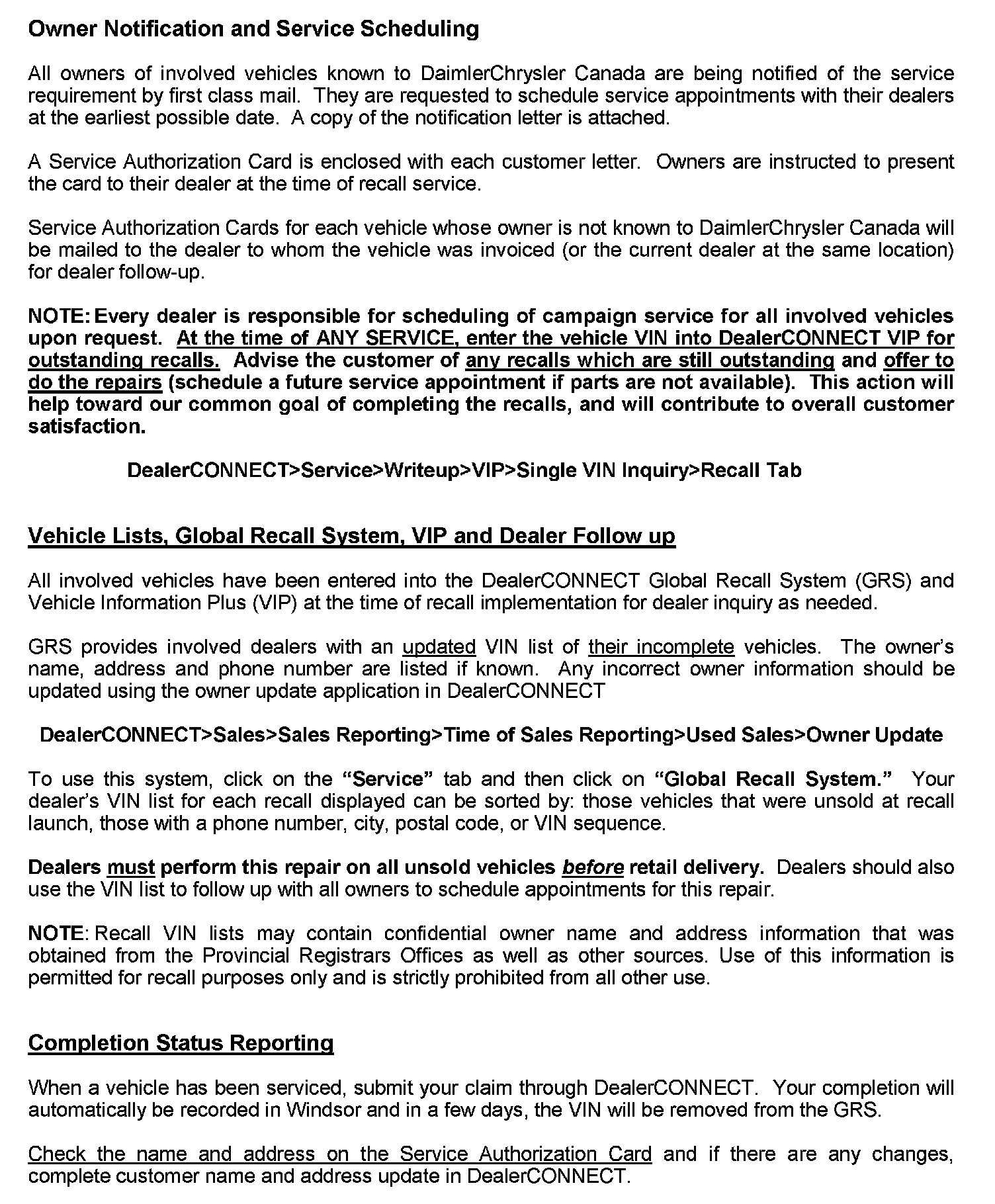 Global Recall System (GRS) has been developed to provide dealers with an up-to-date list of involved vehicles by recall number and by dealer code. Owners known to DaimlerChrysler are also listed. Involved vehicles will be removed from GRS within several days of submitting repair claims.