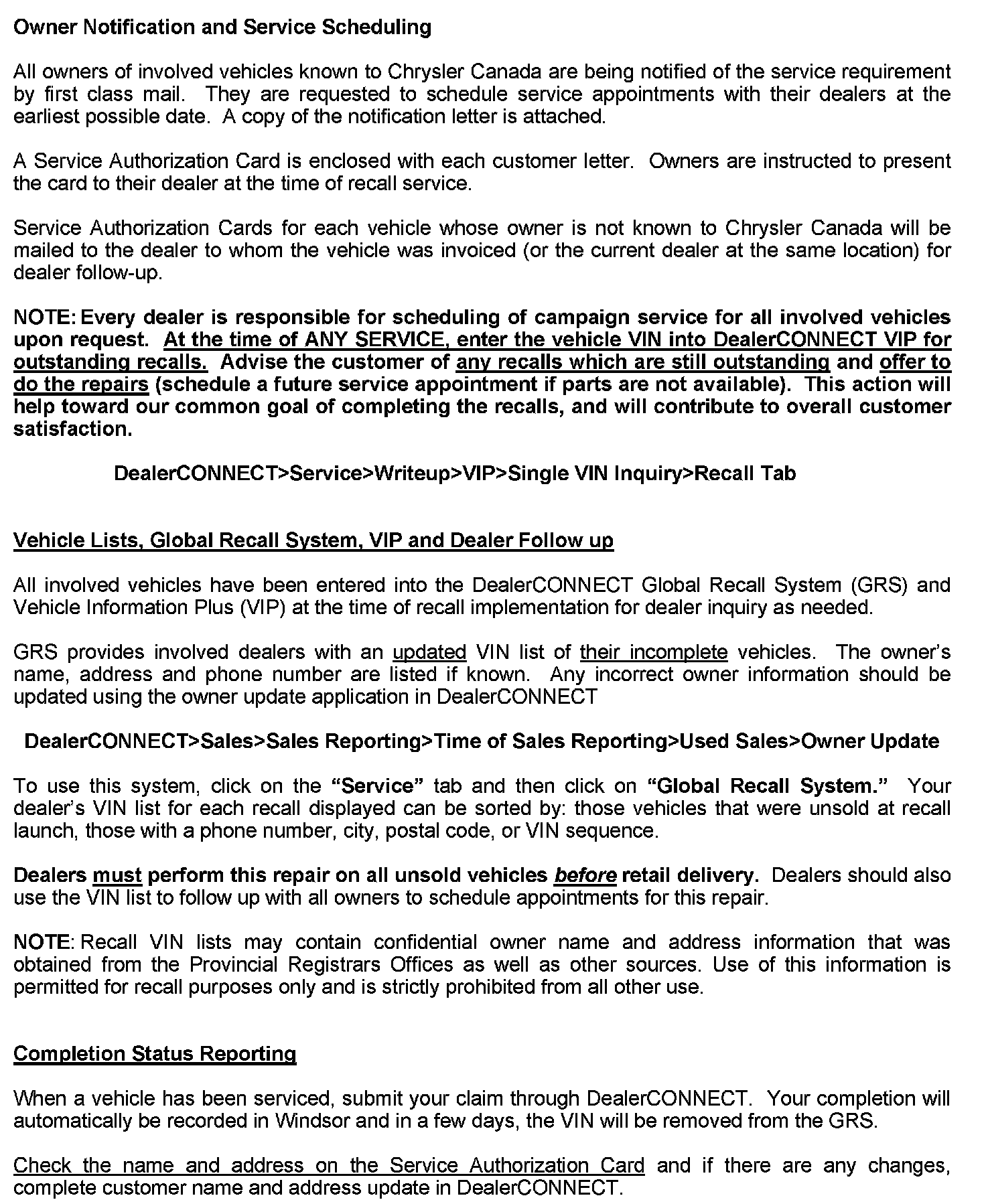 submitted will be used by Chrysler to record Customer Satisfaction Notification service completions and provide dealer payments.