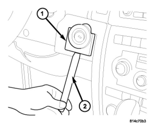 4. Use a plastic trim removal stick (2) to remove ignition switch bezel (1). Bezel snaps on.