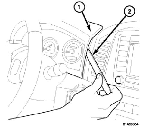 5. Use a plastic trim removal stick (2) to remove I.P. cluster bezel (1). Bezel snaps on.