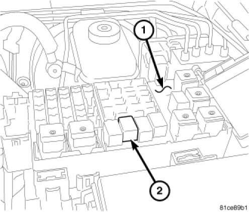 1. Position the A/C clutch relay (2) into the receptacle of the power distribution center (PDC) (1).