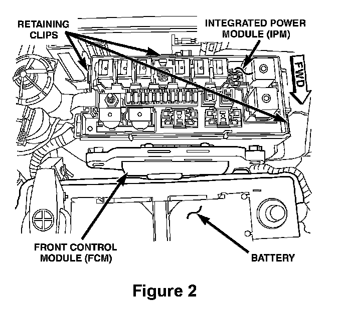 d. Using a suitable flat bladed tool, depress the three retaining clips and lift the IPM straight up off of the bracket tabs (Figure 2).
