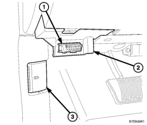 The Data Link Connector (DLC) (1) is a 16-way molded plastic connector insulator on a dedicated take out of the instrument panel wire harness. This connector is located at the lower edge of the instrument panel, outboard of the steering column. The connector insulator is retained by integral snap features within a rectangular cutout in a mounting bracket (2) integral to the lower instrument panel base trim, just below the lower edge of the instrument panel steering column opening cover and inboard of the inside hood release (3) on the inner cowl side trim.
