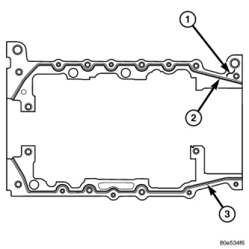 4. Apply a 2.5mm (0.100 inch) bead of Mopar(R) Engine RTV sealant to the cylinder block-to-bedplate mating surface (1) and (2).