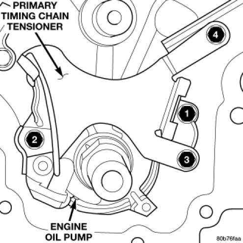 2. Position the primary timing chain tensioner and install three retaining bolts.