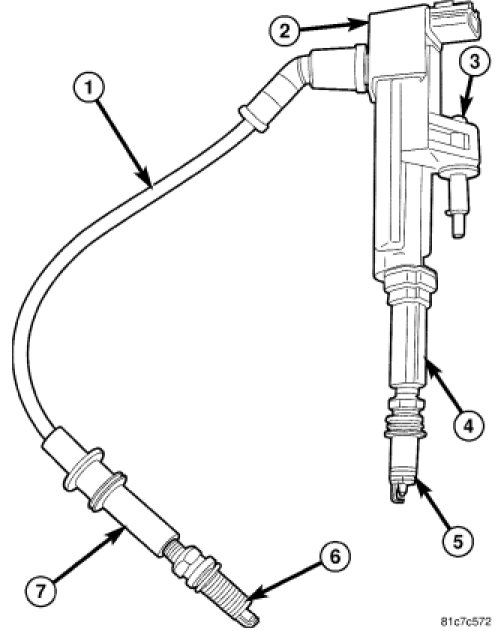 1. To aid in coil installation, apply silicone based grease such as Mopar(R) Dielectric Grease # J8126688 into spark plug end of rubber boots (4) and (7). Also apply this grease to the tops of spark plugs (5) and (6).