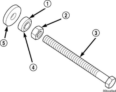 2. Assemble Special Tool 8512-A as follows, The nut (2) is threaded onto the shaft first. Then the roller bearing (1) is placed onto the threaded rod (3) (The hardened bearing surface of the bearing (1) MUST face the nut (2). Then the hardened washer (5) slides onto the threaded rod. Once assembled coat the threaded rod's threads with MOPAR (R) Nickel Anti-Seize or equivalent.