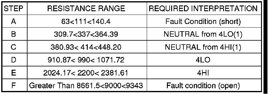 NOTE: There is no requirement for the FDCM to distinguish between a neutral request from the 4LO or the 4HI position. Resistances in these ranges will be represented as a Neutral Switch Activation.