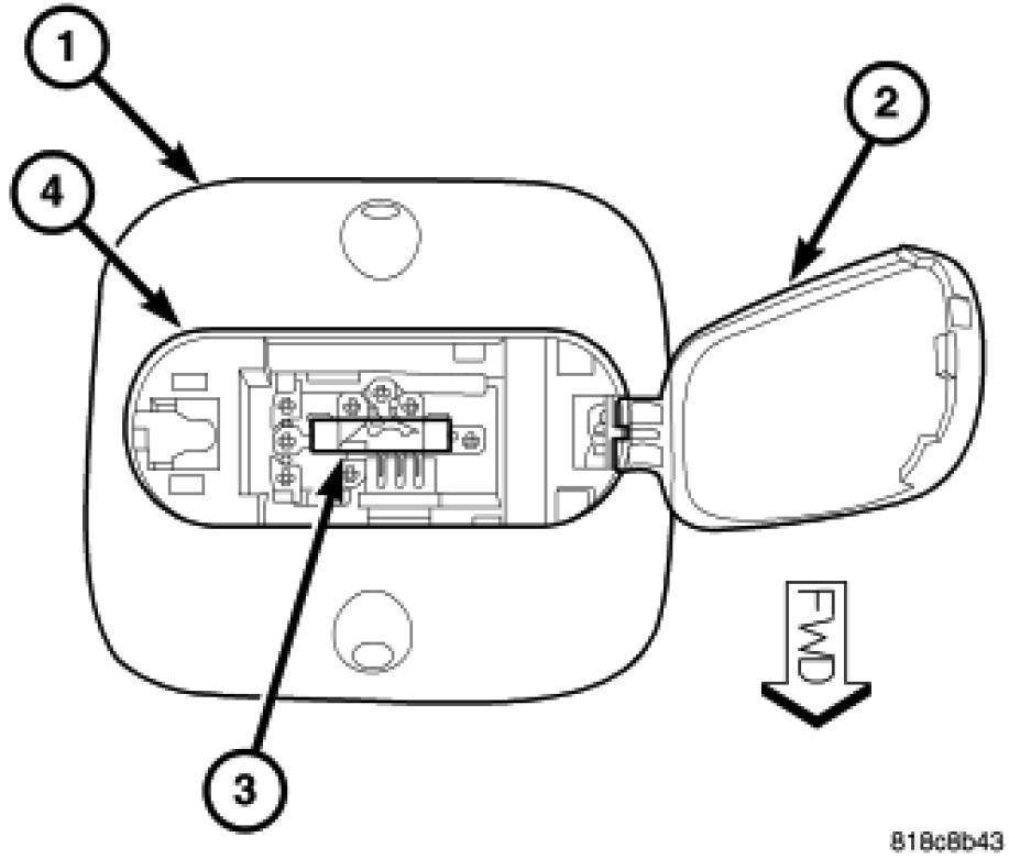 4. Slide the notched end (4) of the housing into the mounting hole far enough to engage the rear dome lamp lens hinge/retainer into the opposite side of the hole in the headliner.