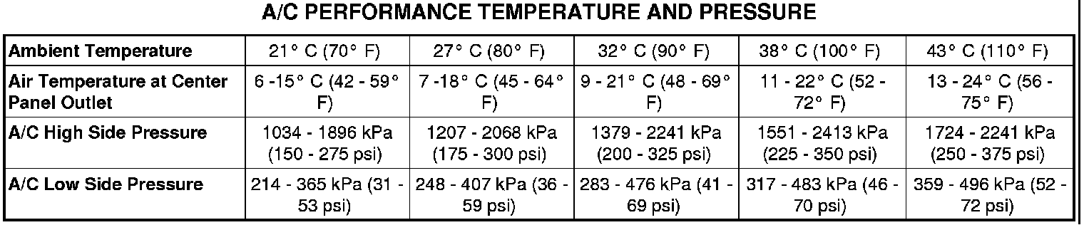 5. Compare the air temperature at the center panel outlet and the A/C system pressures to the A/C Performance Temperature and Pressure chart.