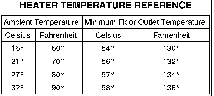 Engine coolant is delivered to and from the heater core through two heater hoses. With the engine idling at normal operating temperature, set the temperature control to the full hot position, the mode control to the floor position, and the blower motor control to the highest speed position. Using a test thermometer, check the temperature of the air being discharged at the front floor outlets. Compare the test thermometer reading to the Heater Temperature Reference chart.