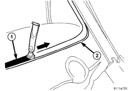 8. Apply primer (1) around the perimeter of the glass to a width of 15 mm (0.5 in.) (2).