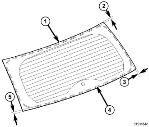 2. Apply bead (4) of adhesive with a triangular nozzle directly to the liftgate glass (1) starting at bottom in center of the liftgate glass.