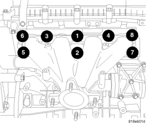 Tighten the exhaust manifold bolts to 34 Nm (25 ft. lbs.) in the sequence shown.