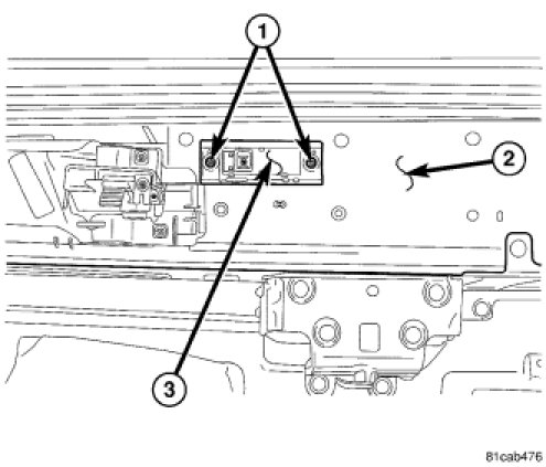 1. Position the memory switch (3) and install and tighten the two screws (1) that secure it to the back of the driver front door trim panel (2).