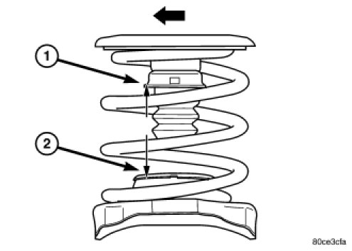 Rear curb height is defined by the relative vertical distance between the top of the lower spring seat strike surface and the bottom of the jounce cup (true metal to metal jounce travel). This is to be measured vertically inside the coil from the point intersecting the inboard edge and the for/aft center of the jounce cup (1) down to the strike surface (2).