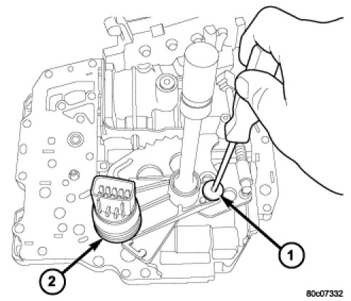 1. Install the TRS (2) to the manual shaft. Make sure TRS locating pin rests in manual valve bore slot.