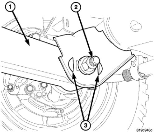 Caster can be adjusted by installing a Mopar(R) cam adjustment kit located between the notches in the axle bracket (3) and moving the lower suspension arm (1) at the axle forward or rearward.