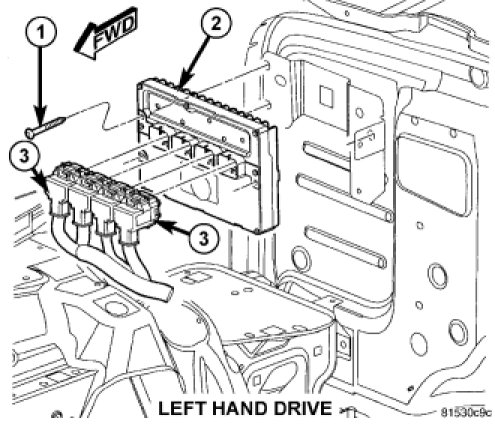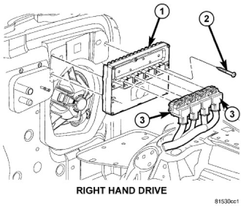 The PCM (2) is located on the right side of the dash panel in the engine compartment on left hand drive vehicles. The PCM is referred to as the NGC.