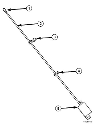The Remote Start Antenna Module Assembly consists of an electrical connection to the Wireless Ignition Node (WIN) (1), a length of coax cable (2), mounting clips, or tie wraps (3) and (4), and a control module/antenna (5).