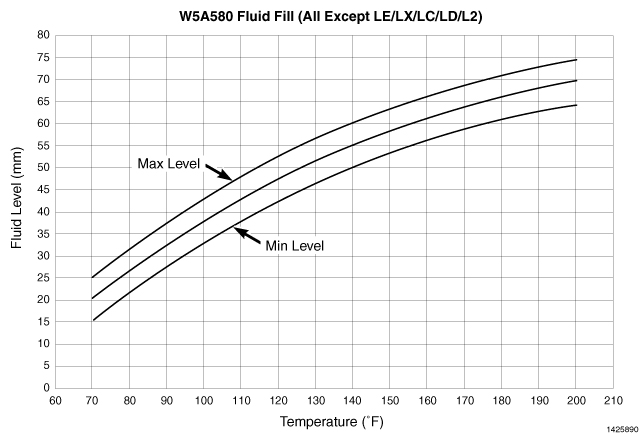 7. With the transmission in "P", determine the height of the oil level on the dipstick and using the height, the transmission temperature, and the Transmission Fluid Graph, determine if the transmission oil level is correct.