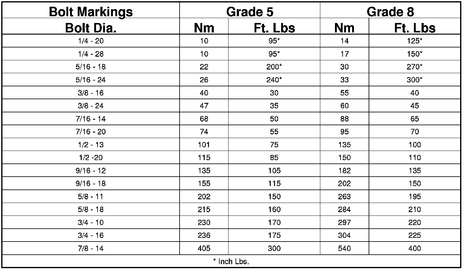 The SAE bolt strength grades range from grade 2 to grade 8. The higher the grade number, the greater the bolt strength. Identification is determined by the line marks on the top of each bolt head. The actual bolt strength grade corresponds to the number of line marks plus 2. The most commonly used metric bolt strength classes are 9.8 and 10.9. The metric strength class identification number is imprinted on the head of the bolt. The higher the class number, the greater the bolt strength. Some metric nuts are imprinted with a single-digit strength class on the nut face. Refer to the Fastener Identification and Fastener Strength Charts.