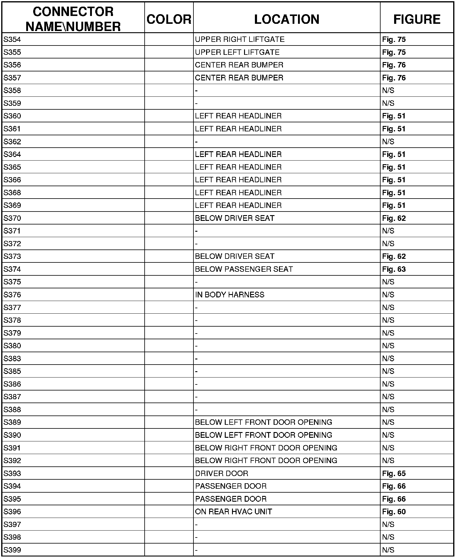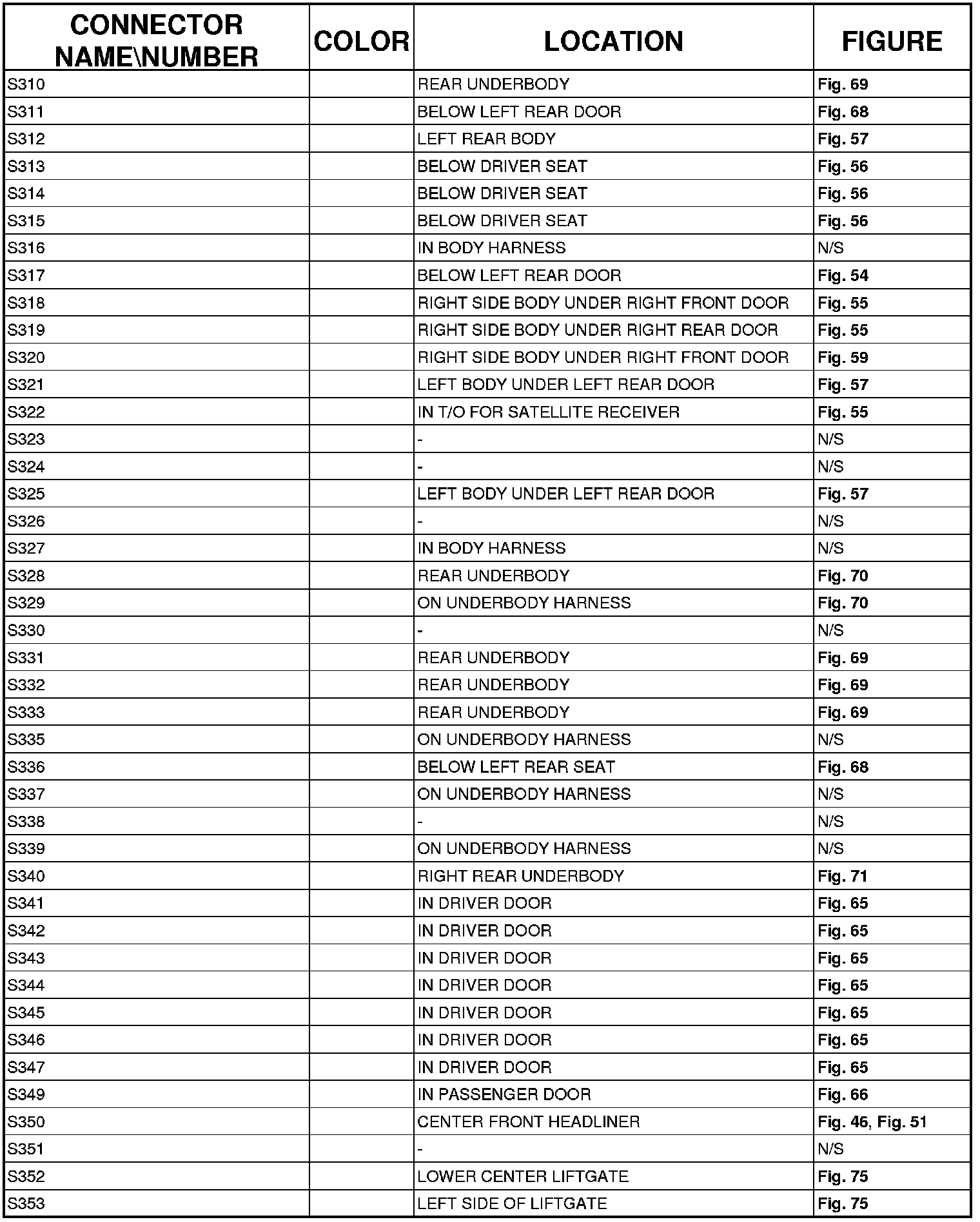 The abbreviation T/O (Take Out) is used in the location column to indicate a point in which the wiring harness branches out to a component.