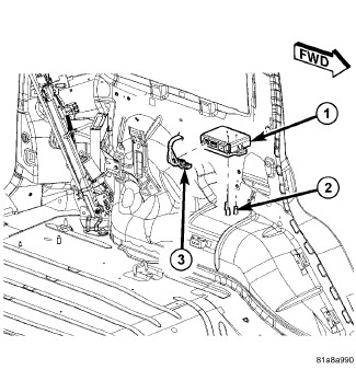 4. Remove the power liftgate control module (1) from the left rear wheel well (2).