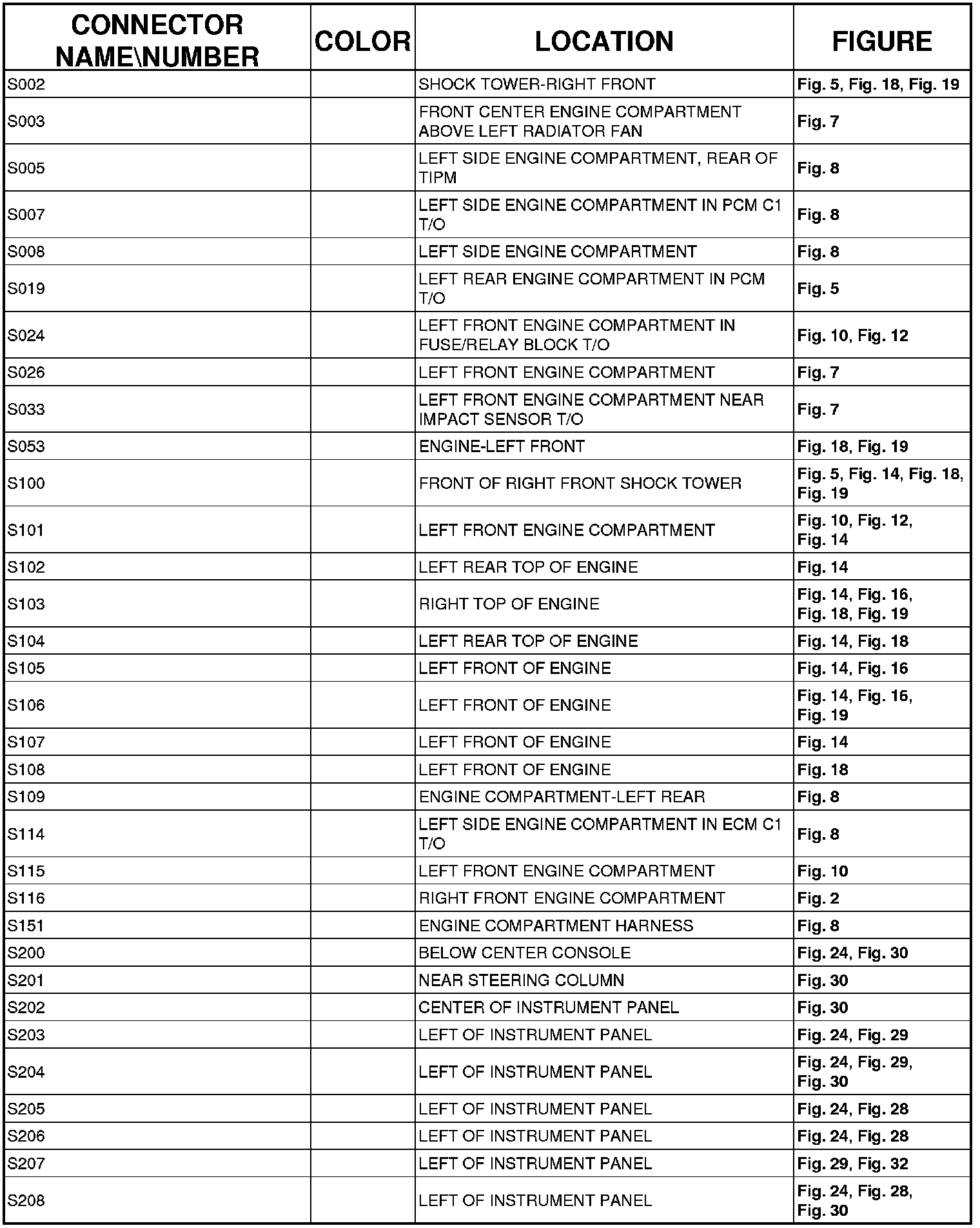 The abbreviation T/O (Take Out) is used in the location column to indicate a point in which the wiring harness branches out to a component.