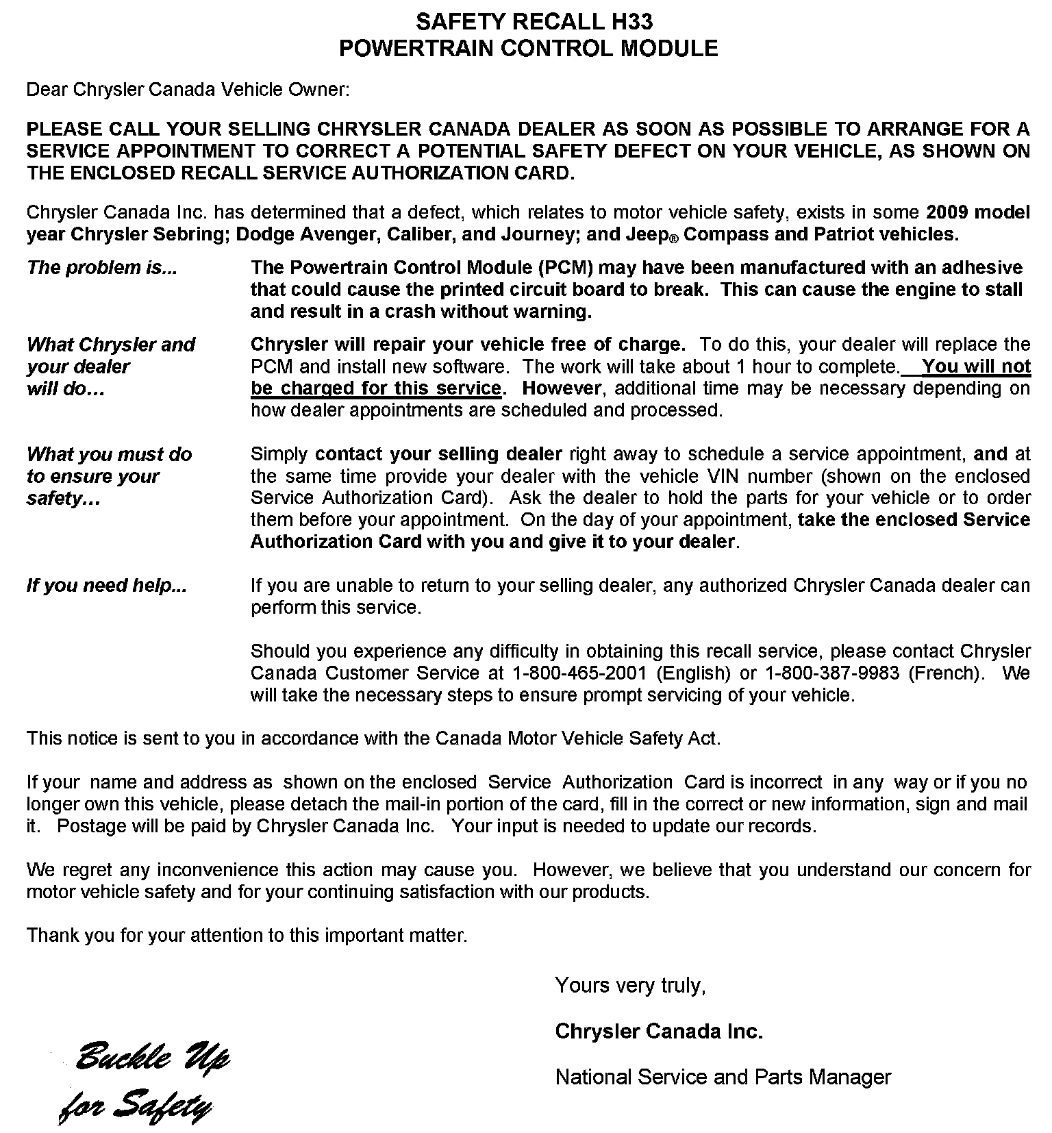 Home >> Jeep >> 2009 >> Compass 2WD L4-2.4L >> Repair and Diagnosis >> Powertrain Management >> Computers and Control Systems >> Engine Control Module >> Technical Service Bulletins >> Recalls >> Canada - Recall - H33 Powertrain Control Module