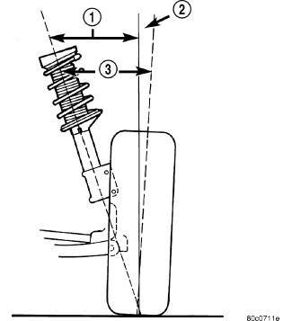 Included angle (3) is the sum of the S.A.I. angle (1) plus or minus the camber angle (2), depending on whether or not the wheel has positive or negative camber. If camber is positive, add the camber angle to the S.A.I angle. If camber is negative, subtract the camber angle from the S.A.I. angle. Included angle is not adjustable, but can be used to diagnose a frame misalignment or bent suspension component (spindle, strut).