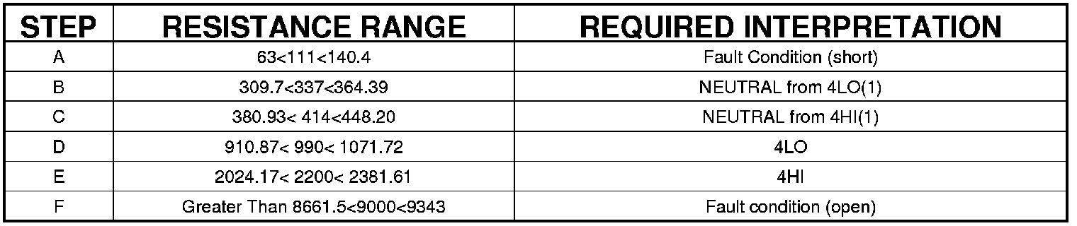 NOTE: There is no requirement for the FDCM to distinguish between a neutral request from the 4LO or the 4HI position. Resistances in these ranges will be represented as a Neutral Switch Activation.