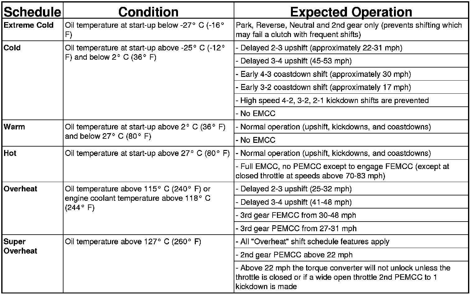 As driving conditions change, the TCM appropriately adjusts the shift schedule. Refer to the following table 42RLE Shift Schedule to determine the appropriate operation expected, depending on driving conditions.