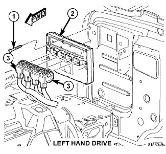The PCM (2) is located on the right side of the dash panel in the engine compartment on left hand drive vehicles. The PCM is referred to as the NGC.