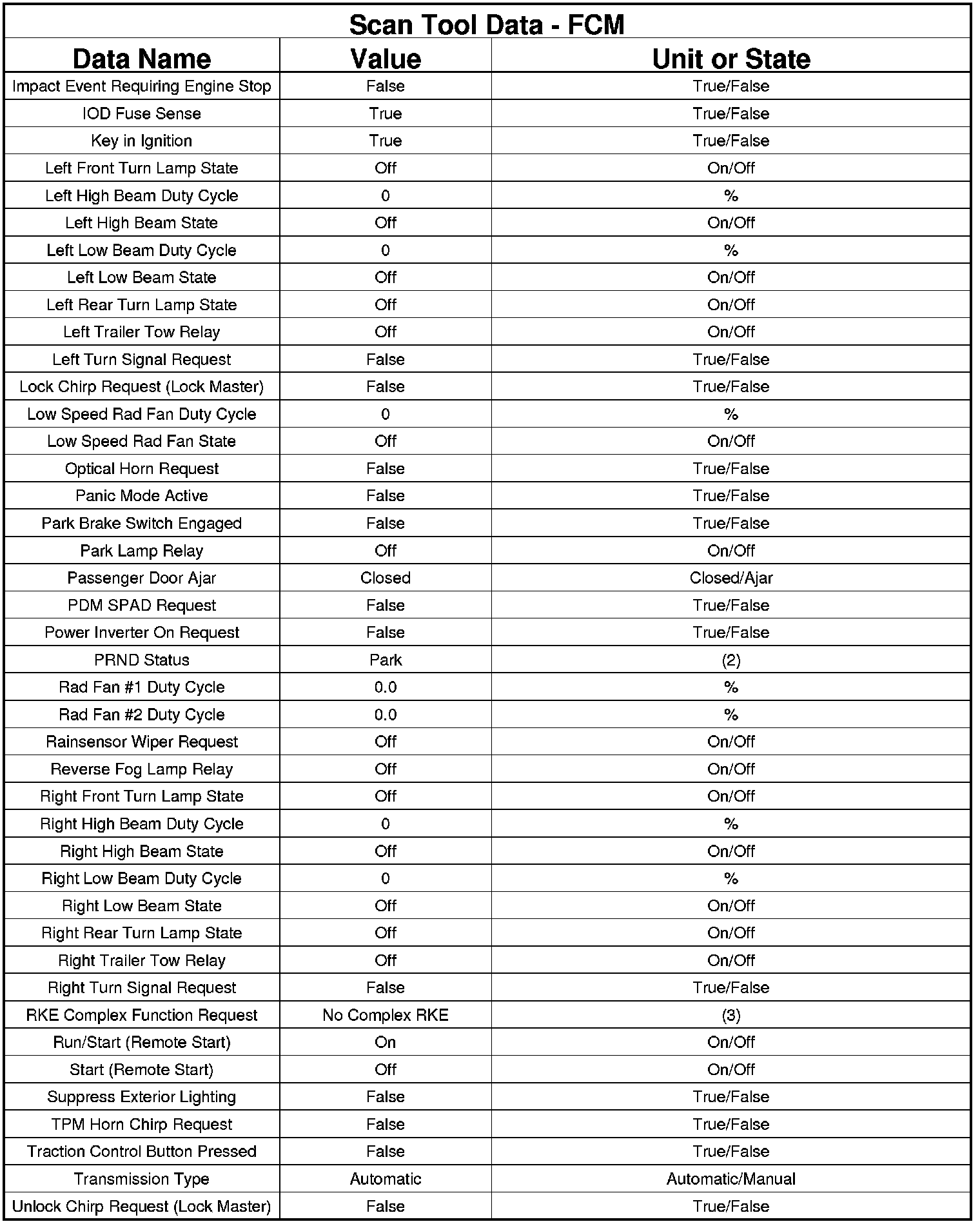 The following chart lists data values taken from the Scan Tool Front Control Module (FCM) data list. The data is to be used for reference only.