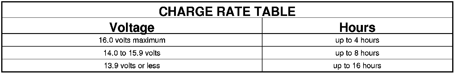 3. Battery chargers vary in the amount of voltage and current they provide. The amount of time required for a battery to accept measurable charging current at various voltages is shown in the Charge Rate Table. If the charging current is still not measurable at the end of the charging time, the battery is inoperative and must be replaced. If the charging current is measurable during the charging time, the battery may be good and the charging should be completed in the normal manner.