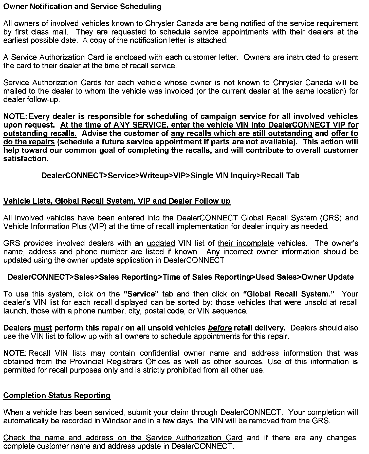 GRS has been developed to provide dealers with an up-to-date list of involved vehicles by recall number and by dealer code. Owners known to Chrysler are also listed. Involved vehicles will be removed from the GRS within several days of submitting repair claims.