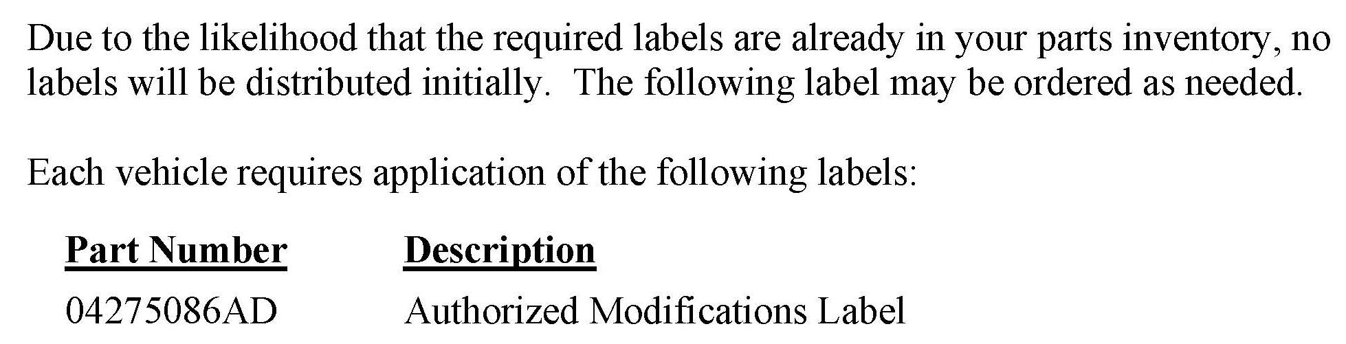 Due to the likelihood that the required labels are already in your parts inventory, no labels will be distributed initially. The following label may be ordered as needed.