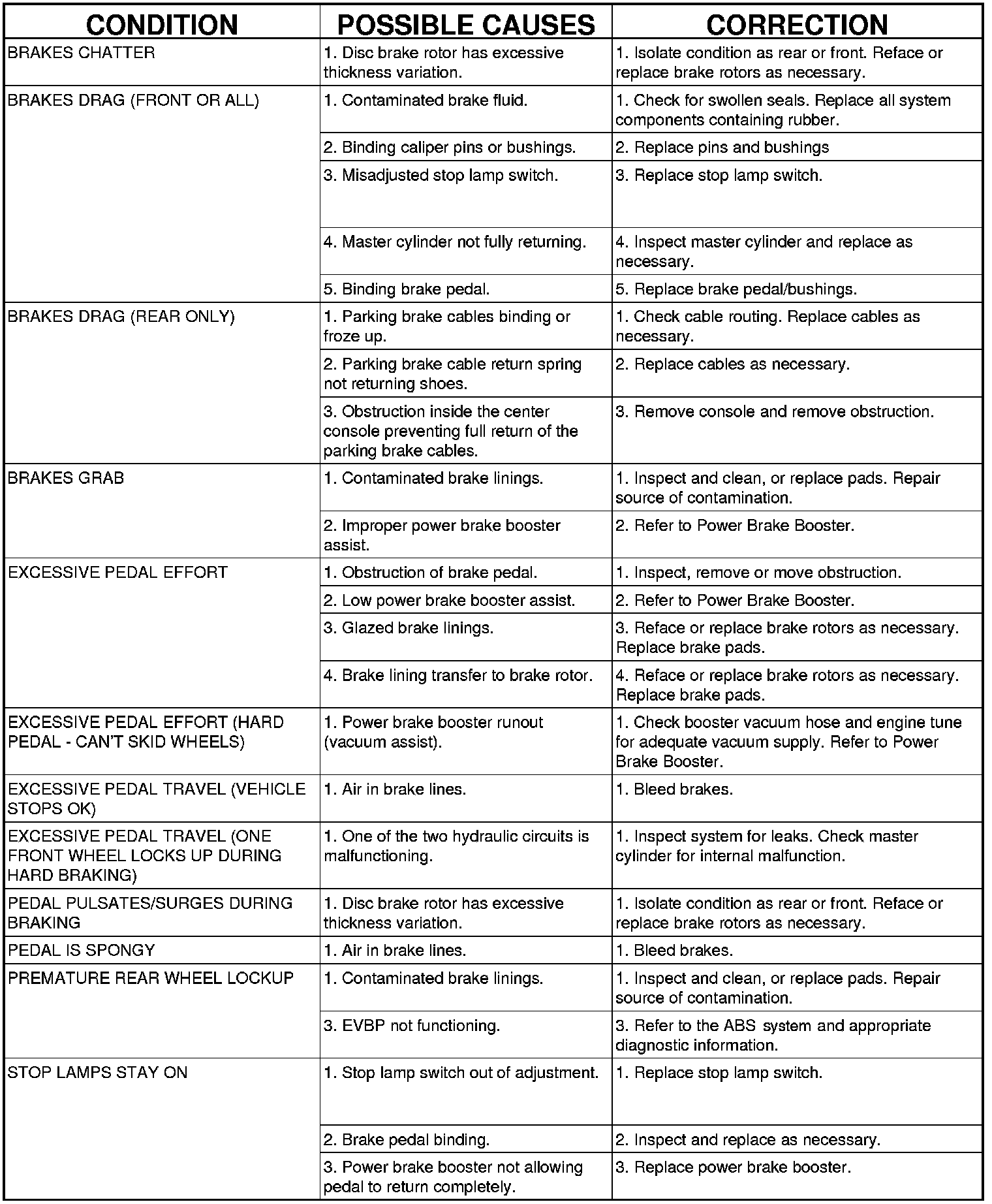 BASE BRAKE SYSTEM DIAGNOSIS CHARTS