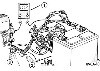 3. Connect the voltmeter (2) to measure between the battery positive cable terminal clamp (1) and the starter solenoid B(+) terminal stud (3). Rotate and hold the ignition switch in the Start position. Observe the voltmeter. If the reading is above 0.2 volt, clean and tighten the battery positive cable eyelet terminal connection at the starter solenoid B(+) terminal stud. Repeat the test. If the reading is still above 0.2 volt, replace the faulty battery positive cable.