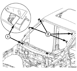 2. Apply four new spacers (2) to the A-pillars and place them evenly apart at the top and bottom.