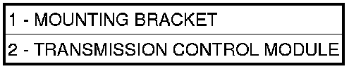 The transmission control module (TCM) (2) and mounting bracket (1) is mounted under the center dash panel, on the transmission hump.