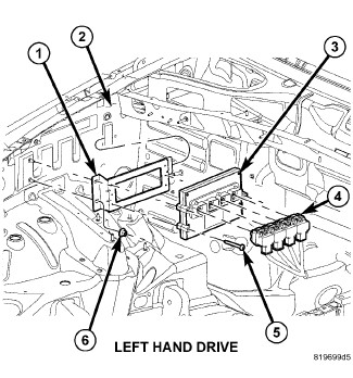 5. Remove PCM (3-Left Hand Drive), or (3-Right Hand Drive) from vehicle.