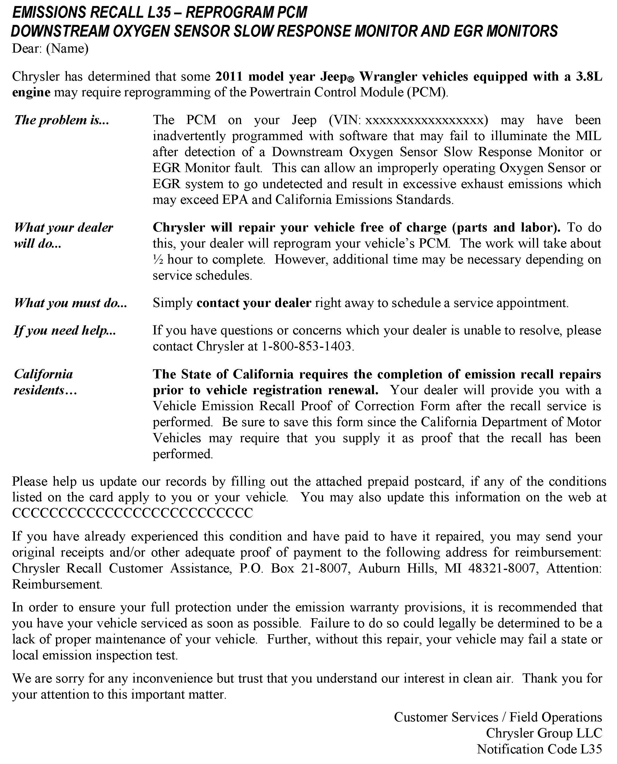 Recall - ECM Update For O2 Sensor/EGR Fault Detection