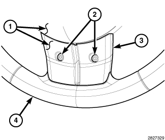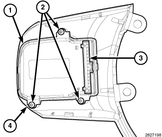 4. Position the front spoke bezel (4), EVIC switch pod (1) and speed control switch pod (3) as a unit to the steering wheel. Be certain that the steering wheel wire harness is routed between the lower or upper bezel stanchions and the inside circumference of the steering wheel hub cavity so that the wiring will not be pinched when the driver airbag is reinstalled.