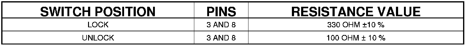 2. Using an ohmmeter, refer to Door Lock Switch Test table to determine if switch resistance is correct in the Lock and Unlock switch positions. Refer to Wiring Diagrams for harness connector pin-outs.