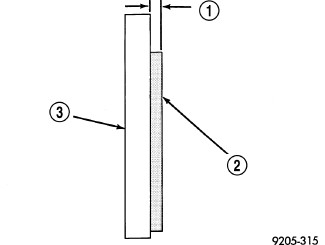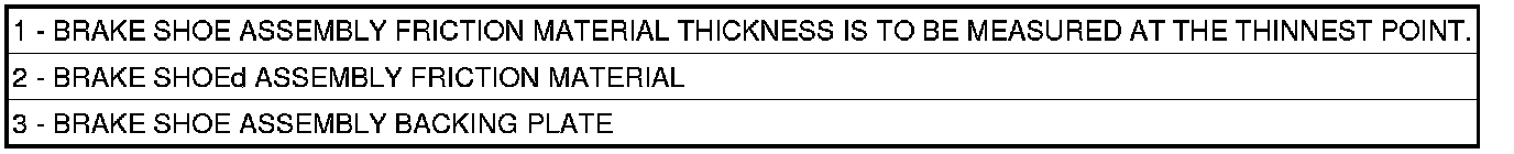 minimum thickness (1). Brake pads must be replaced when usable material on a brake pad lining (2) measured at its thinnest point measures one millimeter (0.04 inches) or less.