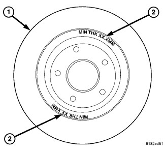 NOTE: All brake rotors (1) have markings for minimum allowable thickness cast on an unmachined surface of the rotor (2) or stamped into the hat section. On this vehicle, the minimum thickness specification for the front brake rotor is located on the inside of the rotor. The minimum thickness specification for the rear brake rotor is located on the outside of the rotor. Minimum thickness specifications can also be found in this component's specification table. [1][2]Brake Rotor/Disc