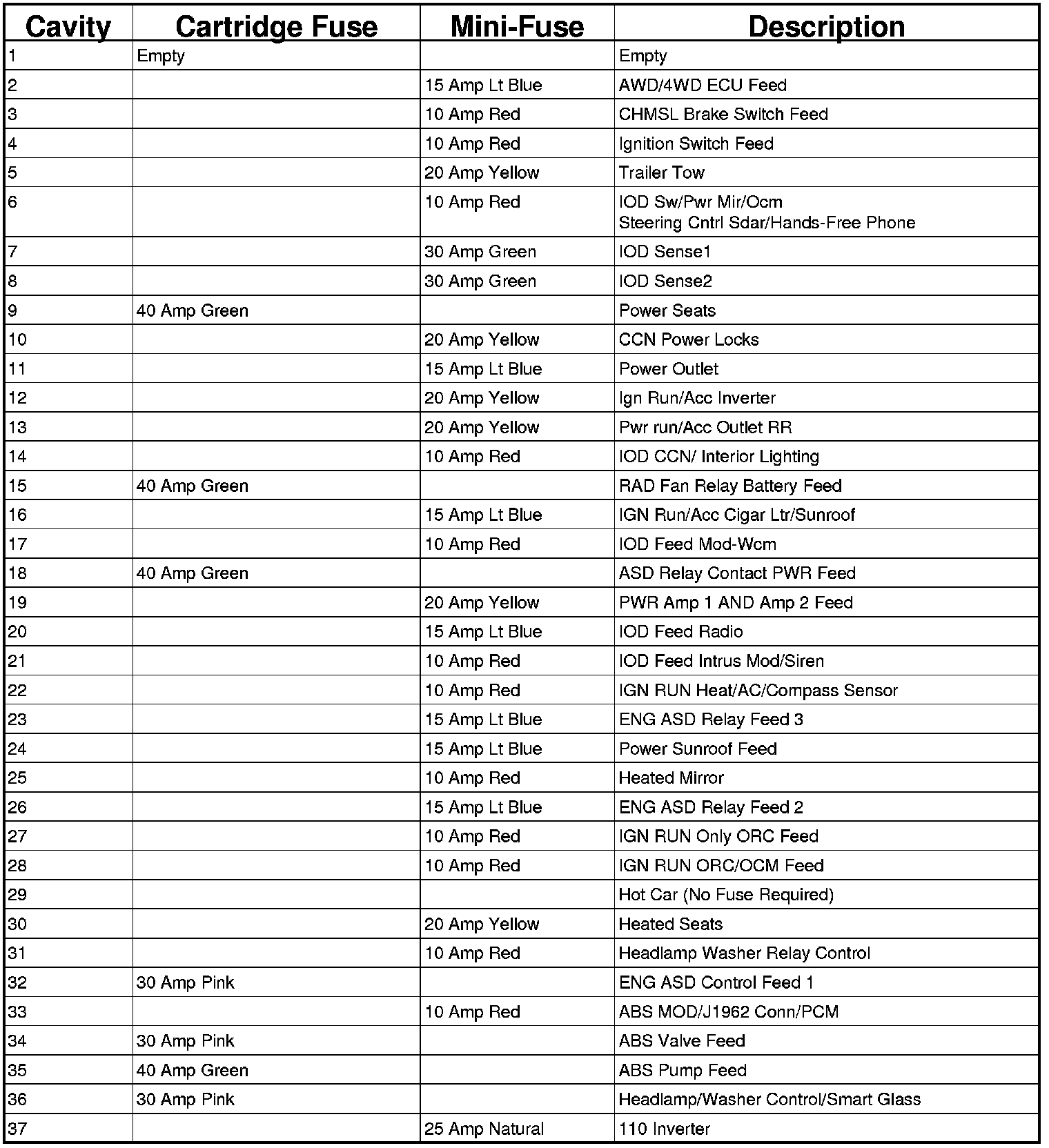 An Integrated Power Module (IPM) is located in the engine compartment near the air cleaner assembly. This center contains cartridge fuses and mini-fuses. A label that identifies each component may be printed on the inside of the cover. Refer to "Engine Compartment" of the underhood location of the IPM.
