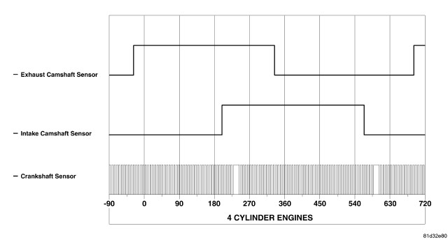 NOTE: The graphic represents the relationship between camshaft and crankshaft sensors edges with camshafts in "lock pin" position (cam shafts are not "phasing"). This is normally seen during idle.